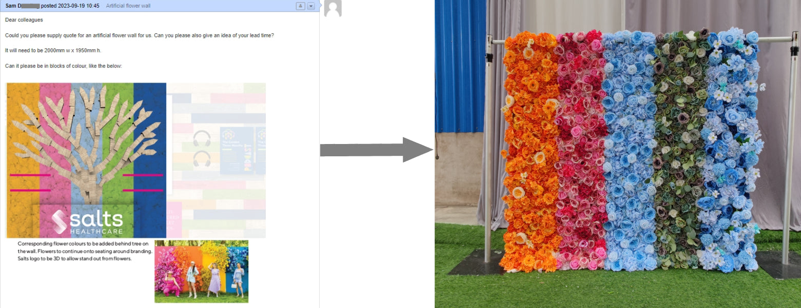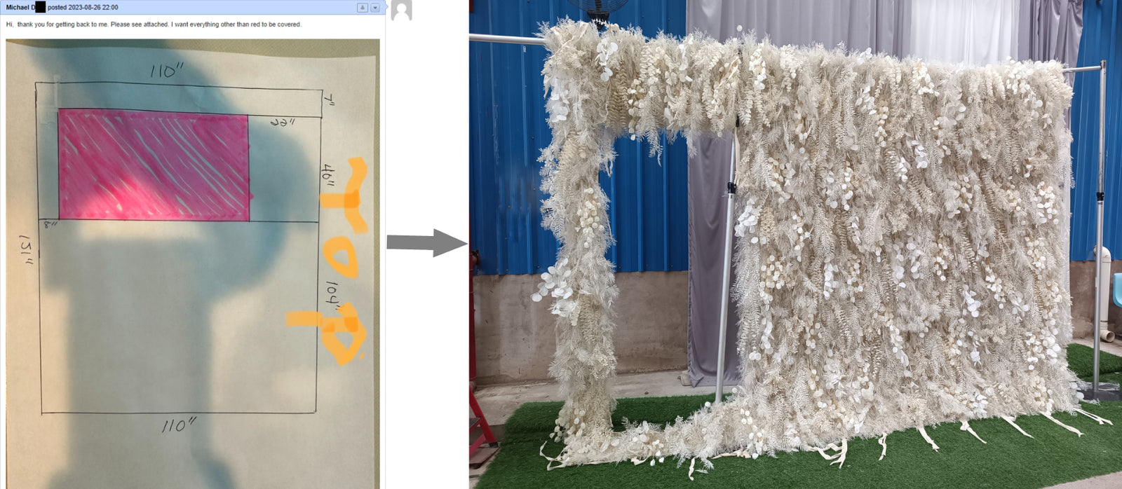 Custom flower walls with unique color requirements and specific size customization. No need for any extras – just share your ideas with us, and we'll bring them to life!